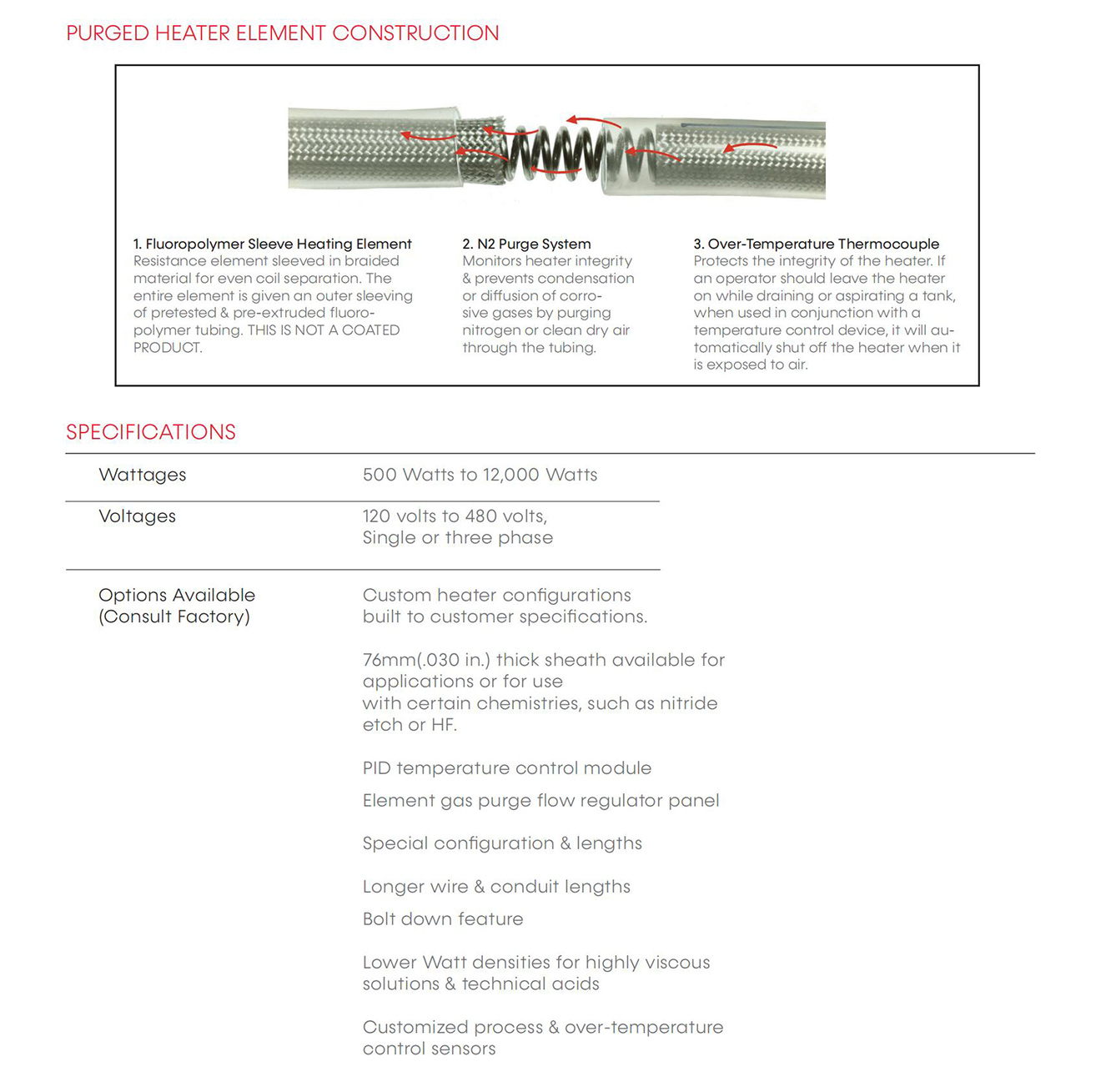 Designed for the most demanding chemical applications and to provide years of trouble-free performance. High efficiency in a compact design, and an excellent alternative for replacing strip heaters on quartz tanks. TFB for bottom heater applications, and TFW for inside tank wall requirements. All wetted parts are fluoropolymer and compatible with virtually any chemistry for unlimited process options (Not to be used with flammable solutions).