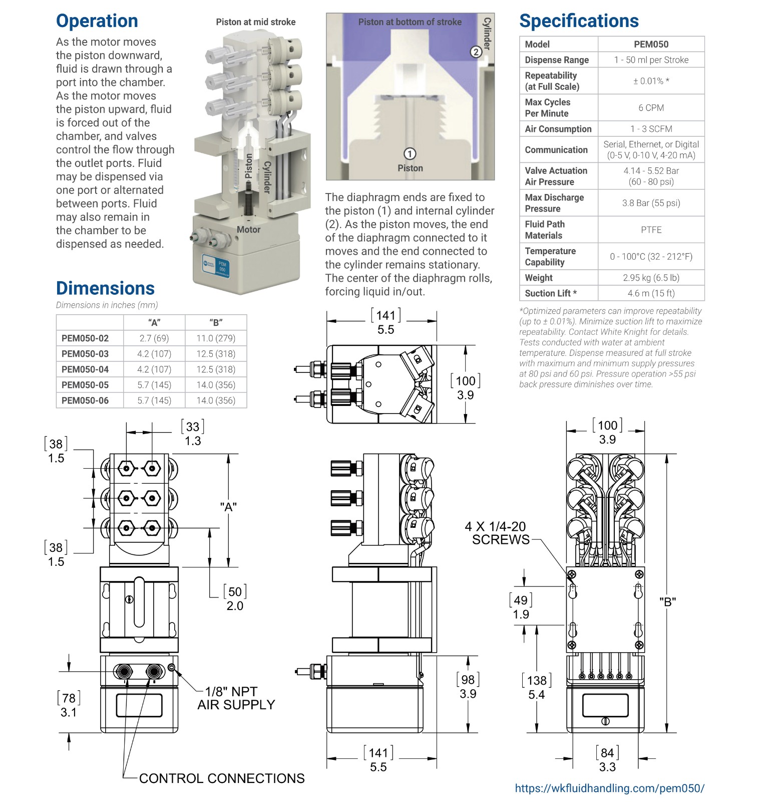 PEM electronic metering pumps accurately dispense 1-50 ml of corrosive media. They feature an adjustable stroke. Their fully supported rolling diaphragm offers 55 psi discharge pressures. They have PTFE flow paths and no exposed metals to prevent corrosion and contamination.