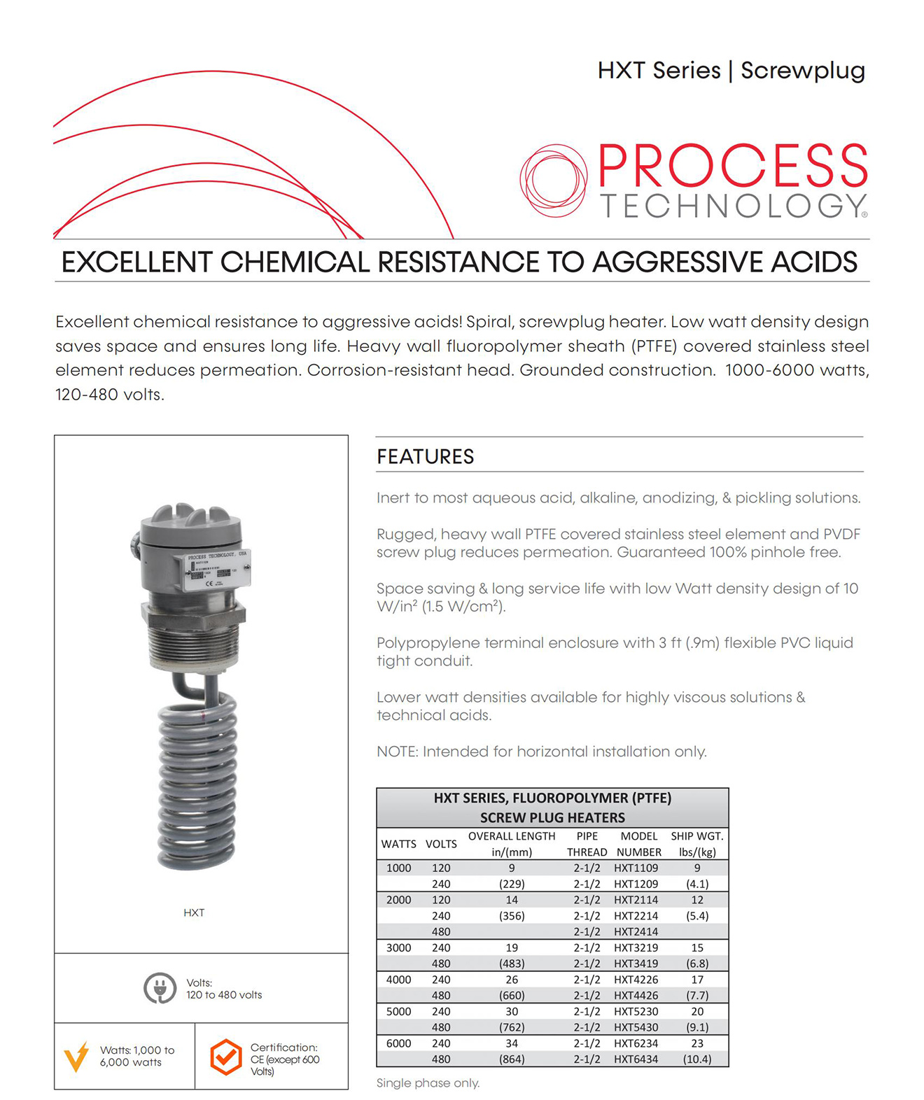 Excellent chemical resistance to aggressive acids! Spiral, screwplug heater. Low watt density design saves space and ensures long life. Heavy wall fluoropolymer sheath (PTFE) covered stainless steel element reduces permeation. Corrosion-resistant head. Grounded construction. 1000-6000 watts, 120-480 volts.